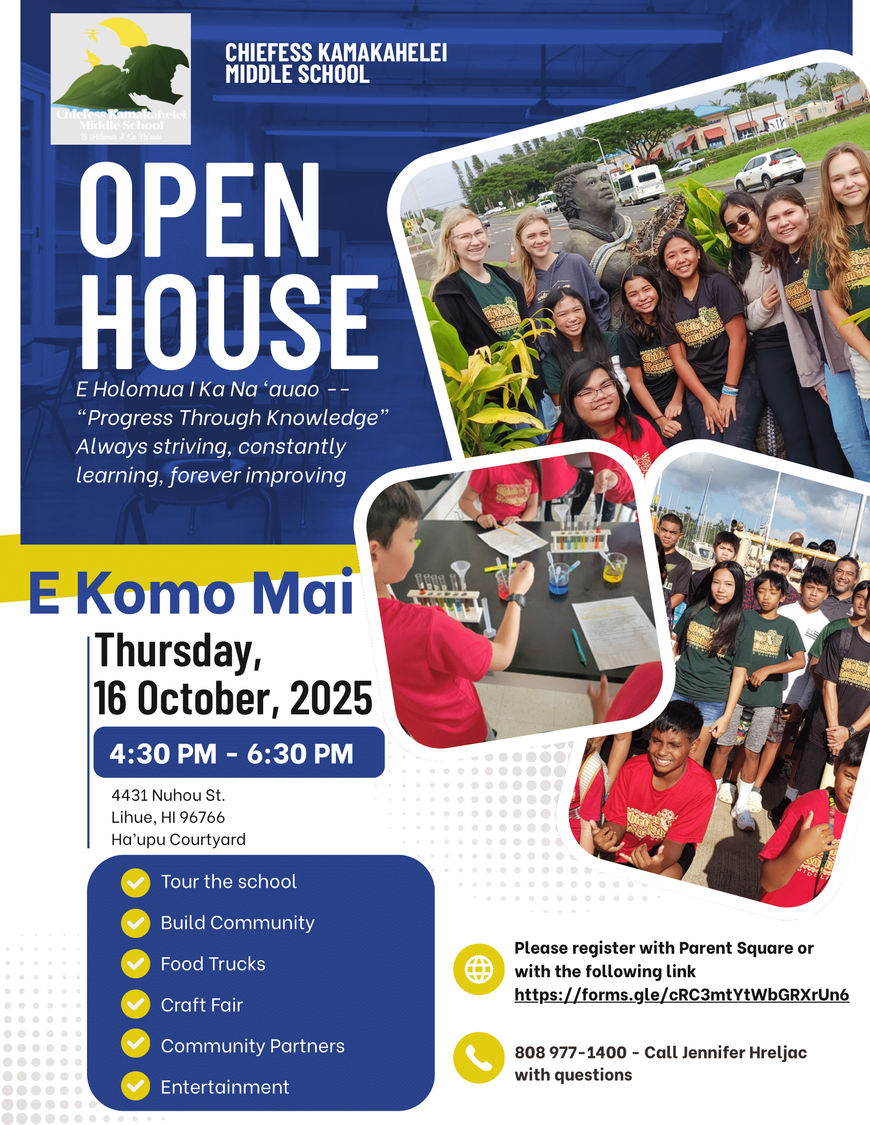 Join us at Chiefess Kamakahelei Middle School for our Open House event! We invite our community to come together, tour the school, and learn more about our commitment to "Progress Through Knowledge" (E Holomua I Ka Na 'auao).